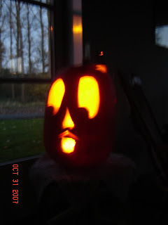 We had no idea what would happen on Halloween, since this is our first year here. We had our pumpkin carved and illuminated. We passed the word at work that we would welcome trick-or-treaters, and one of our colleagues, who lives in the next village over, brought his kids and their Belgian friends by. We asked the Belgians what they say when they trick or treat and one replied, with a puzzled look, "Merci." So we had to rephrase by asking what they say when they knock on the door. We got two answers: "bonbons ou mort" (candy or death) or bonbons ou sort (we're guessing this means "give us candy or be prepared to meet your fate").